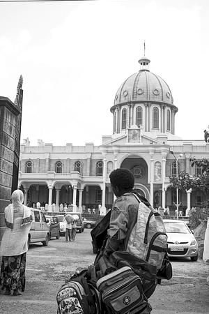 Moment as a kid who sold backpacks on the street is fascinated with a girl as she prays in front of a church